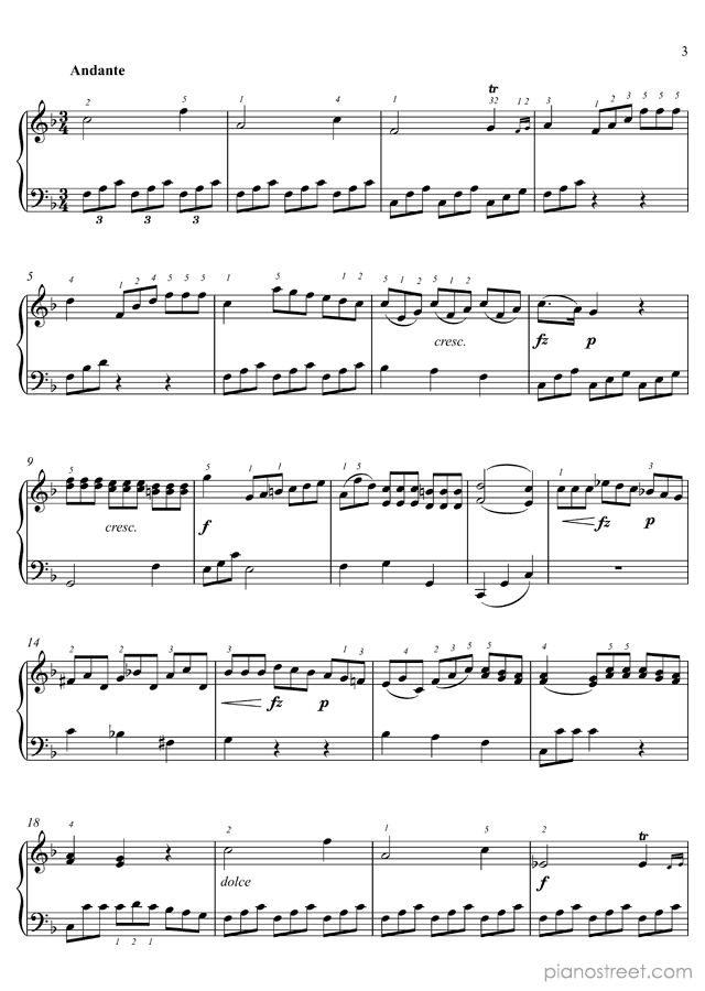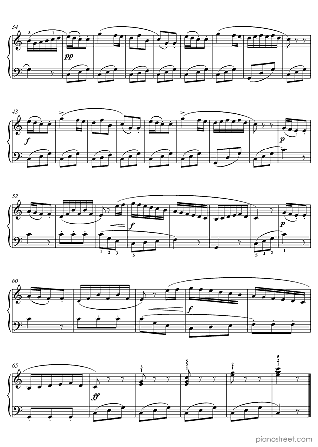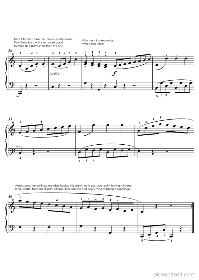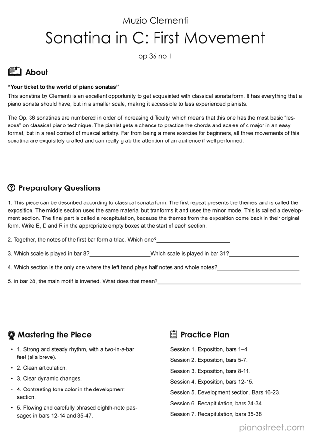 This sonatina by Clementi is an excellent opportunity to get acquainted with classical sonata form. The Op. 36 sonatinas are numbered in order of increasing difficulty, which means that this one has the most basic “lessons” on classical piano technique. The pianist gets a chance to practice the chords and scales of c major in an easy format, but in a real context of musical artistry. The first movement can be described according to classical sonata form, and has a first theme based on the C major triad plus a descending C major scale, and a second theme in the dominant G major, with more scales and passage work for the right hand. The second part develops the the theme in the minor mode. Finally, the themes are both recapitulated in C major with some interesting variations.The second movement has a beautiful cantabile melody in F major, with elements of double note playing, and with a broken chord accompaniment. The transition into the final movement is almost seemless but still very contrasting - the broken chords of the left hand continue at more or less the same tempo, but the time signature changes from 3/4 Andante to 3/8 Vivace, and the new material in the right hand is very rhythmical and playful. This movement also has some brilliant, swirling passagework requiring strong, agile fingers, and a loud Coda.