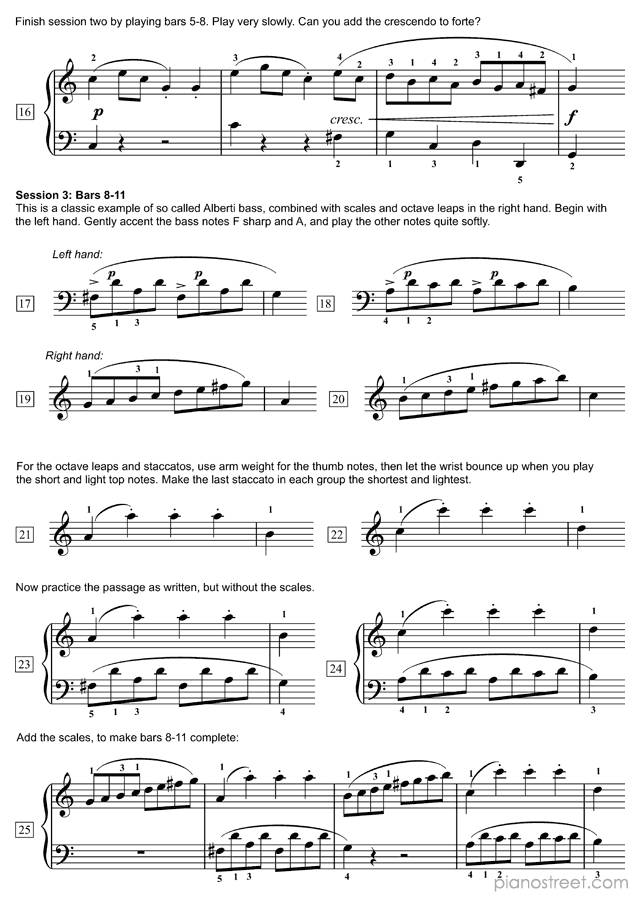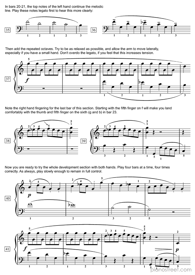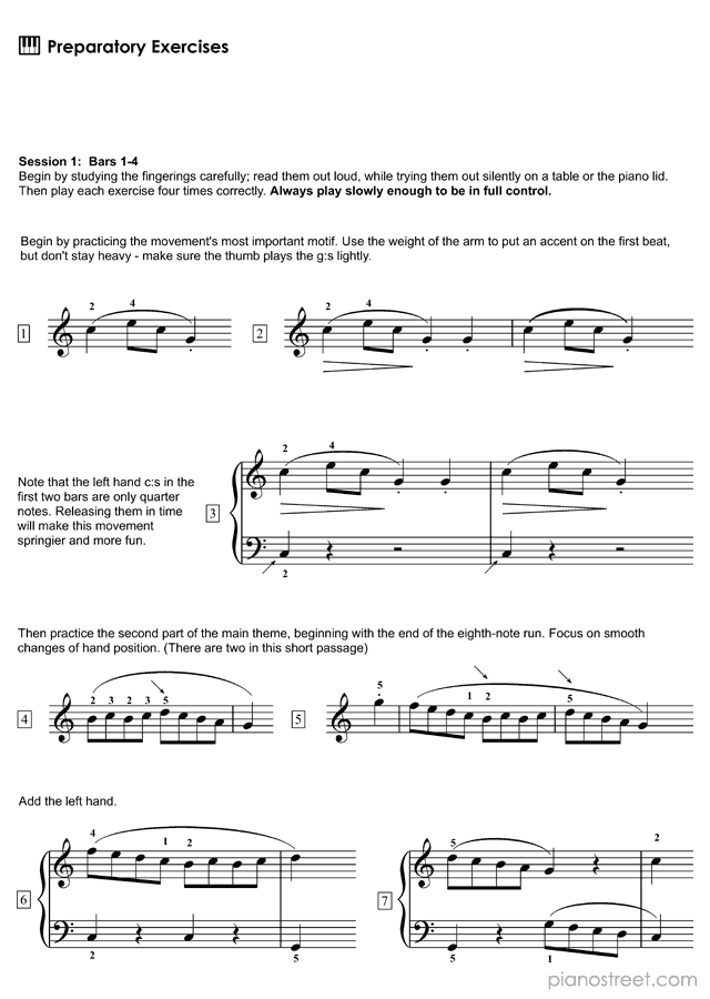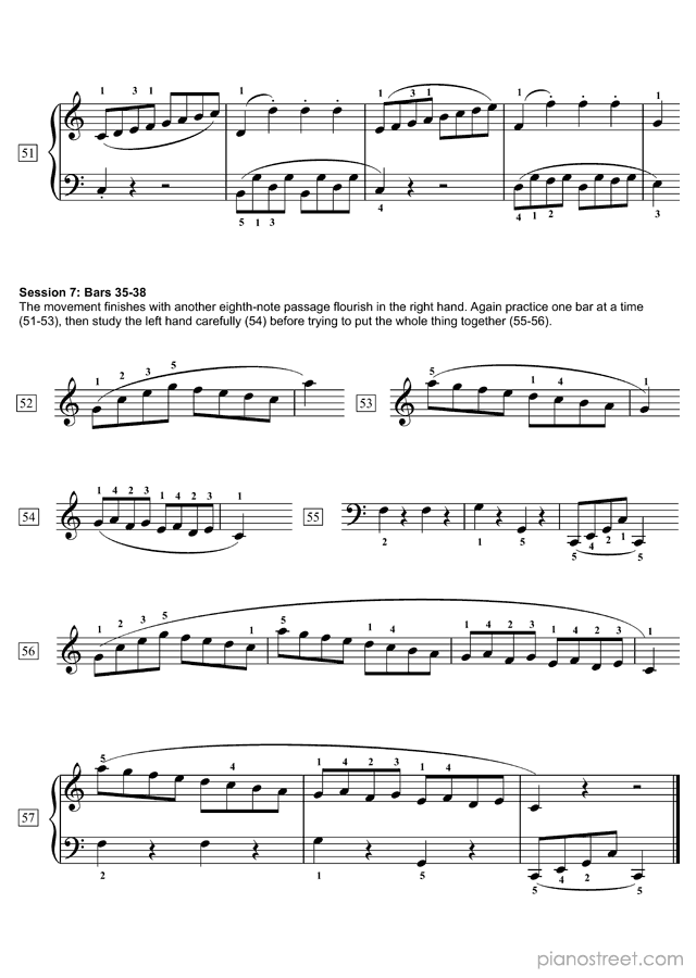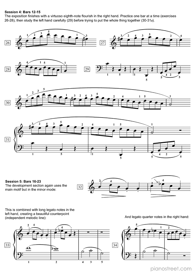I. AllegroThis movement has three sections: an exposition, a development and a recapitulation. It is very important to know where these sections start and end, before you start practicing them.