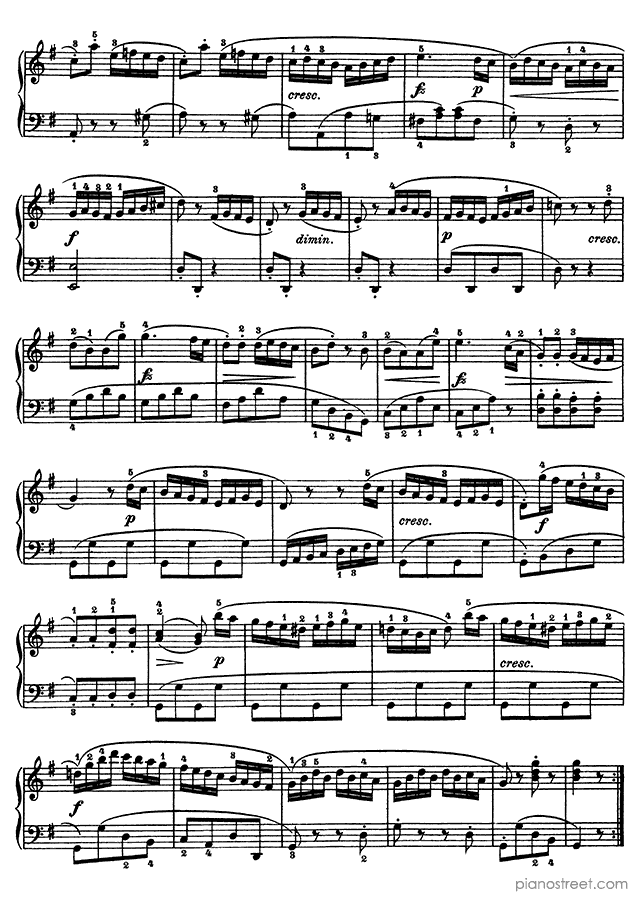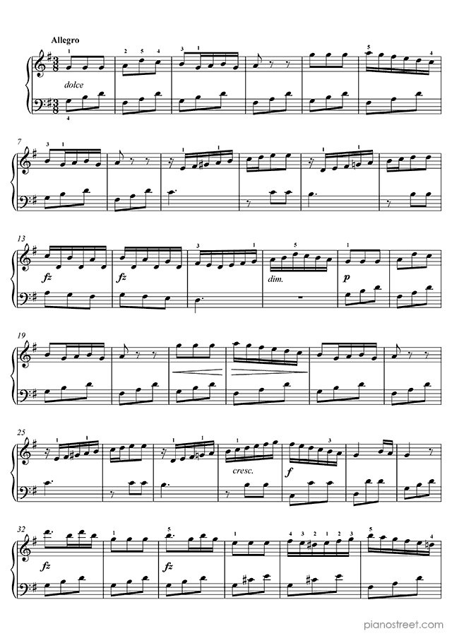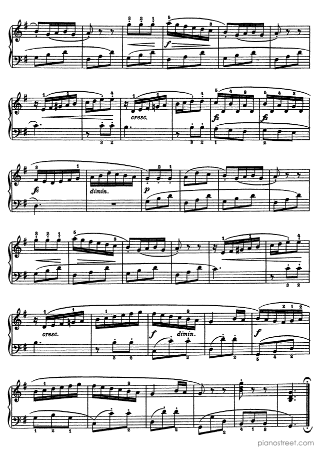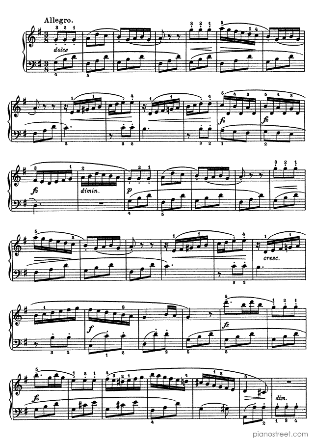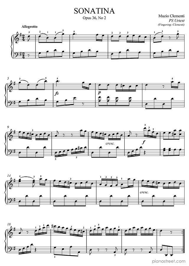 The Sonatina in G major Op 36 no 2 offers the player a slightly greater challenge than the first sonatina from the same opus. The first movement, a graceful Allegretto, challenges the player with an increased quantity of sixteenth-note runs, which need to be executed with evenness and elegance. The second movement, also marked Allegretto, has a calmer pace, the hands conversing in dotted rhythm. The final movement, an Allegro in 3/8, ends the sonatina on an energetic note.Background
