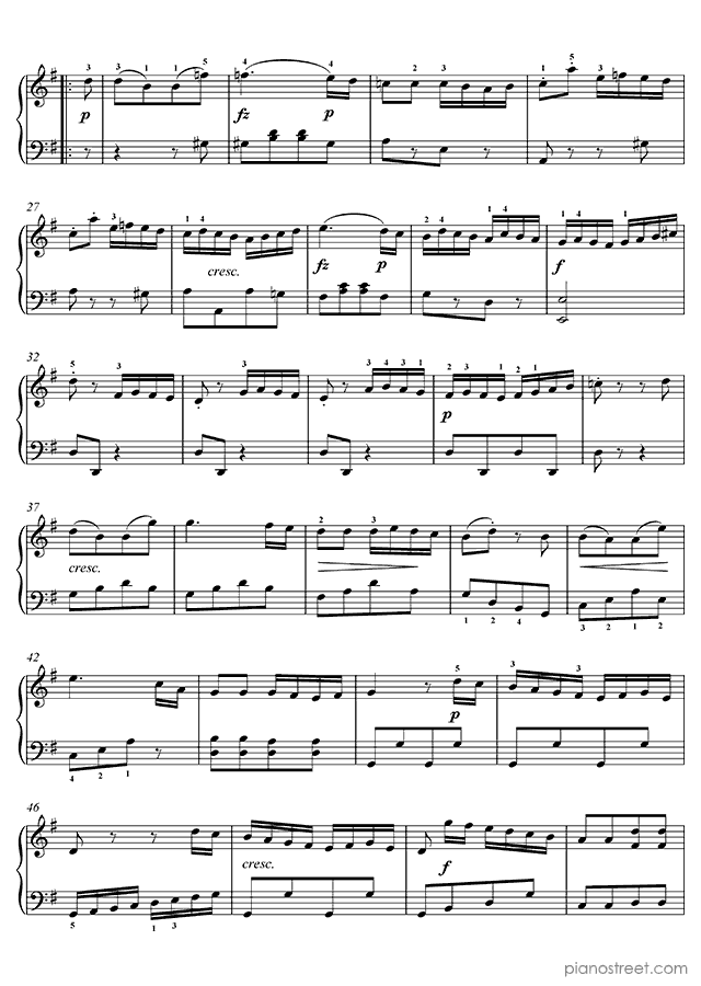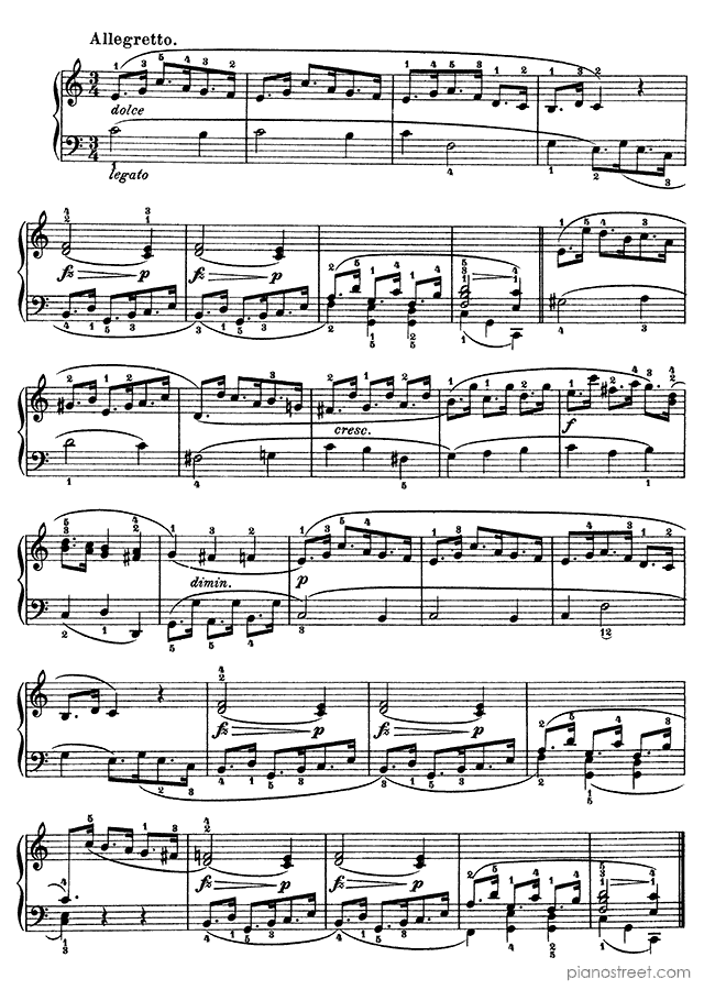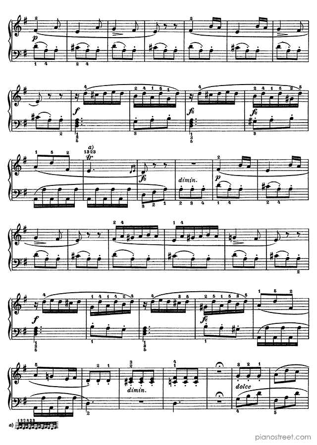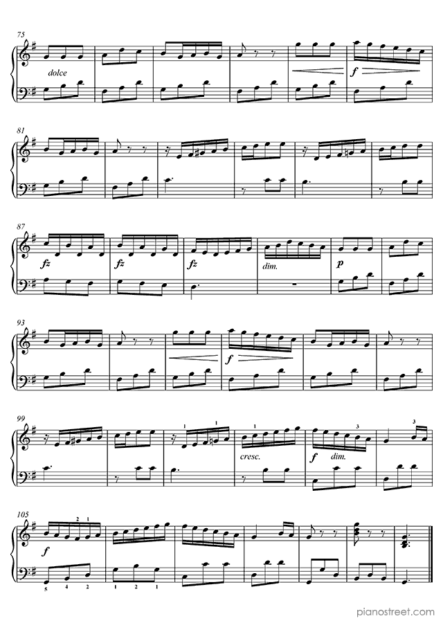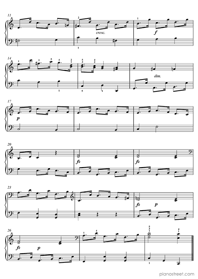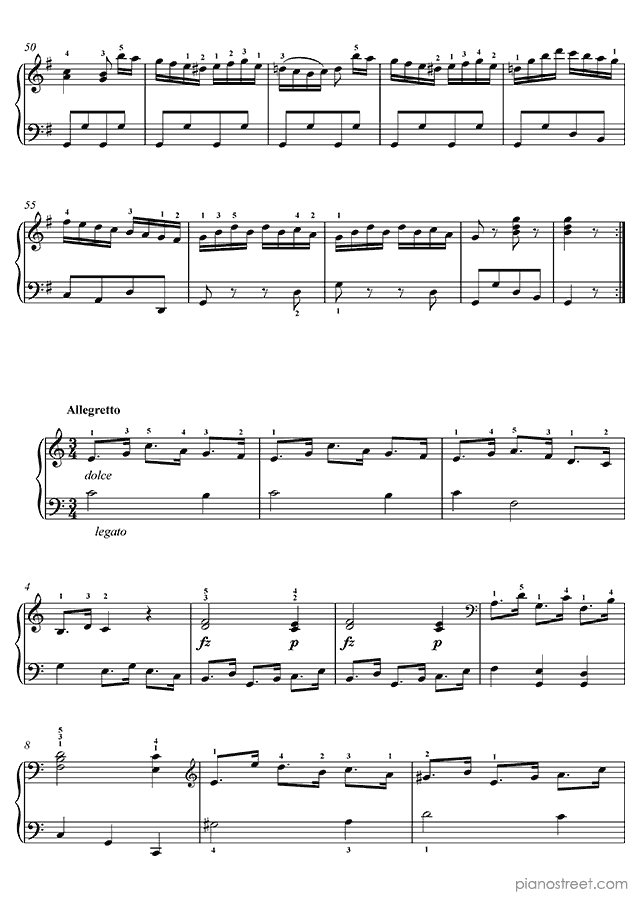 The Sonatina in G major Op 36 no 2 offers the player a slightly greater challenge than the first sonatina from the same opus. The first movement, a graceful Allegretto, challenges the player with an increased quantity of sixteenth-note runs, which need to be executed with evenness and elegance. The second movement, also marked Allegretto, has a calmer pace, the hands conversing in dotted rhythm. The final movement, an Allegro in 3/8, ends the sonatina on an energetic note.Background