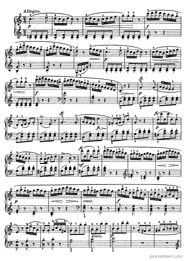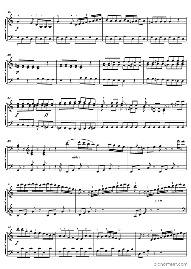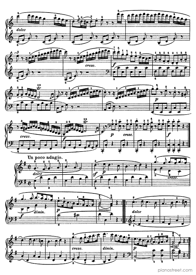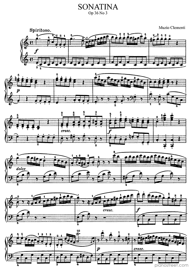 The Sonatina in C major Op. 36 no. 3 is a fun, energetic piece, much like its predecessors from the same opus. Featuring a slight increase in difficulty compared to the previous two sonatinas, the spirited first movement enjoys a lively exploration of an increased range of the keyboard. A lyrical Adagio in dotted rhythms follows, and the sonatina finishes with a jocular Allegro.Background