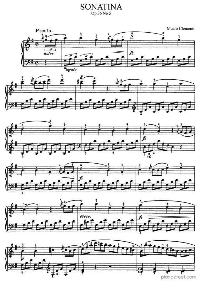Muzio Clementi: Sonatina Op. 36 No. 5 in G Major from Sonatinas - piano sheet music to print instantly. This piece is level 6 and was composed during the Classical period.