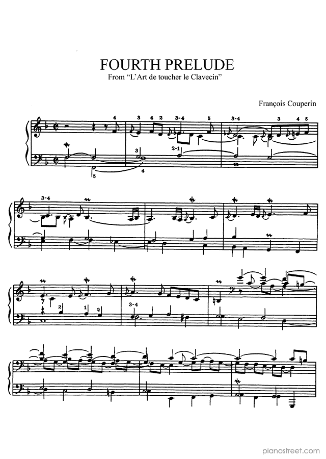 François Couperin: Fourth Prelude No. 4 in F Major from L'Art de toucher le Clavecin - piano sheet music to print instantly. This piece is level 6 and was composed during the Baroque period.
