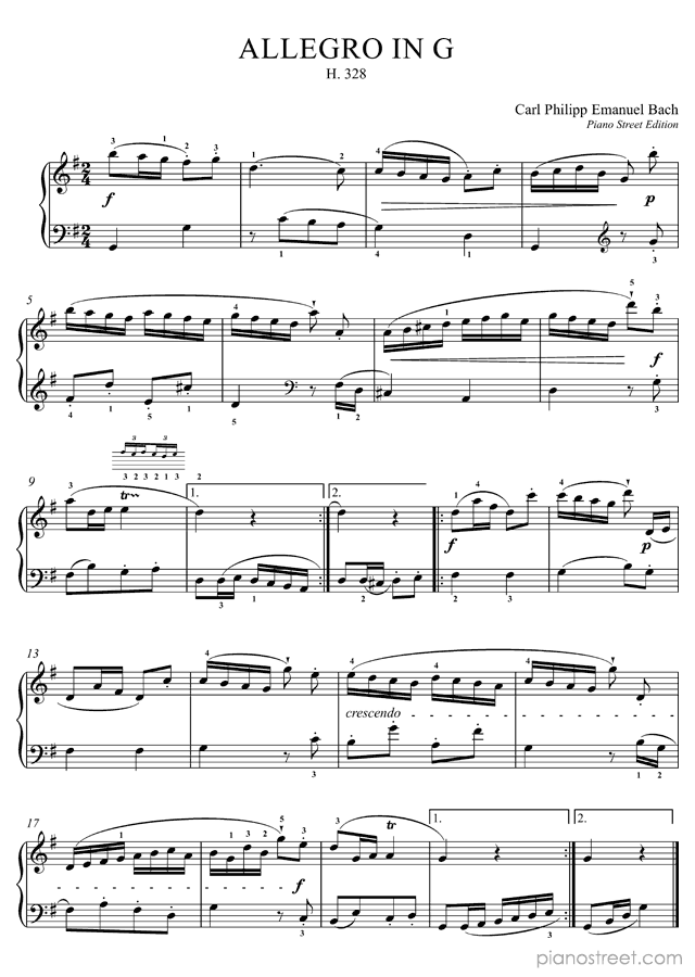 This piece is composed by Carl Philipp Emanuel BachThis piano piece was initially published in the year 1725. Title: Allegro, in G Major . The difficulty level if graded by ABRSM would be approximately 3 and it belongs to the Baroque period.
