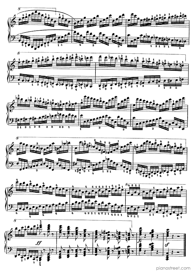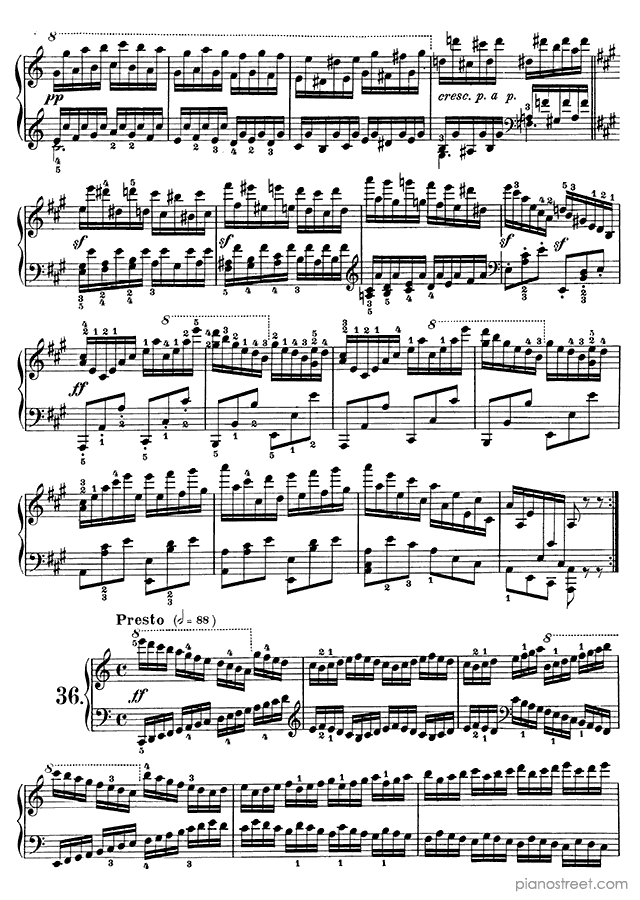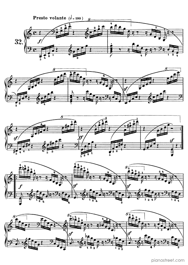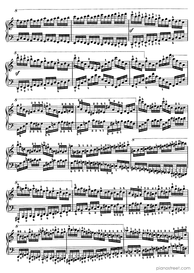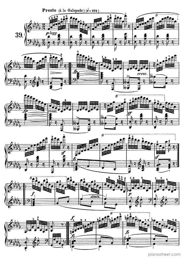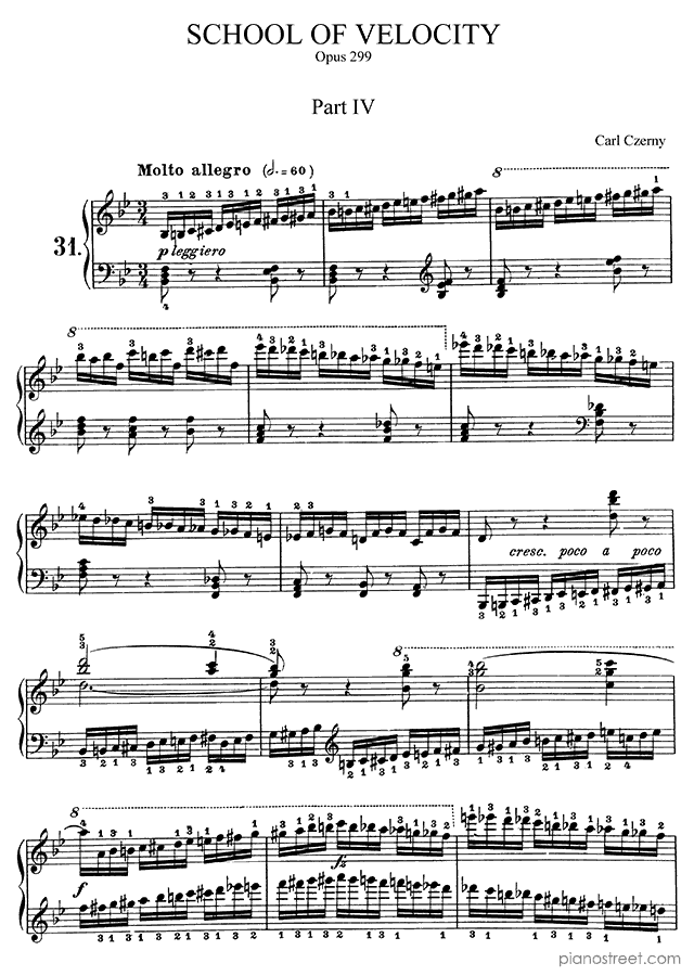 Piano sheet music downloads and recordings. This piece is from School of Velocity by Carl Czerny: Study Op. 299 No. 40 in F Major . Level 8, Period: Classical