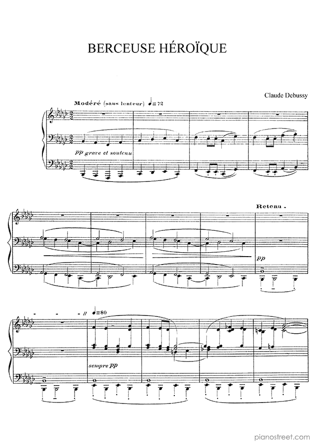 Debussy: Berceuse héroïque (published in 1914) . DOWNLOAD piano sheet music from Piano Street digital sheet music library.