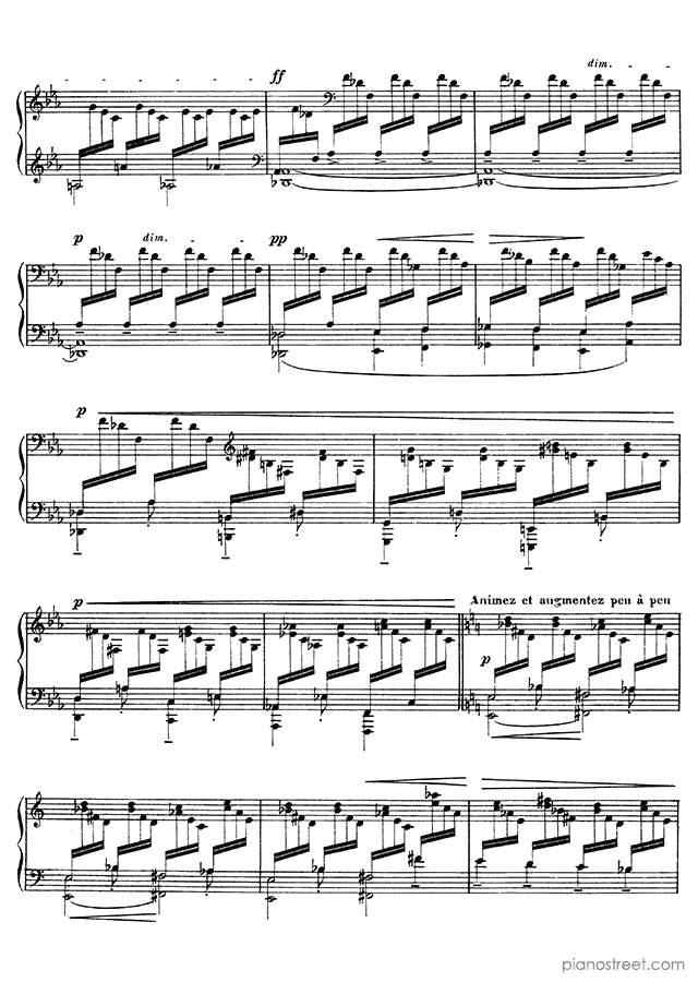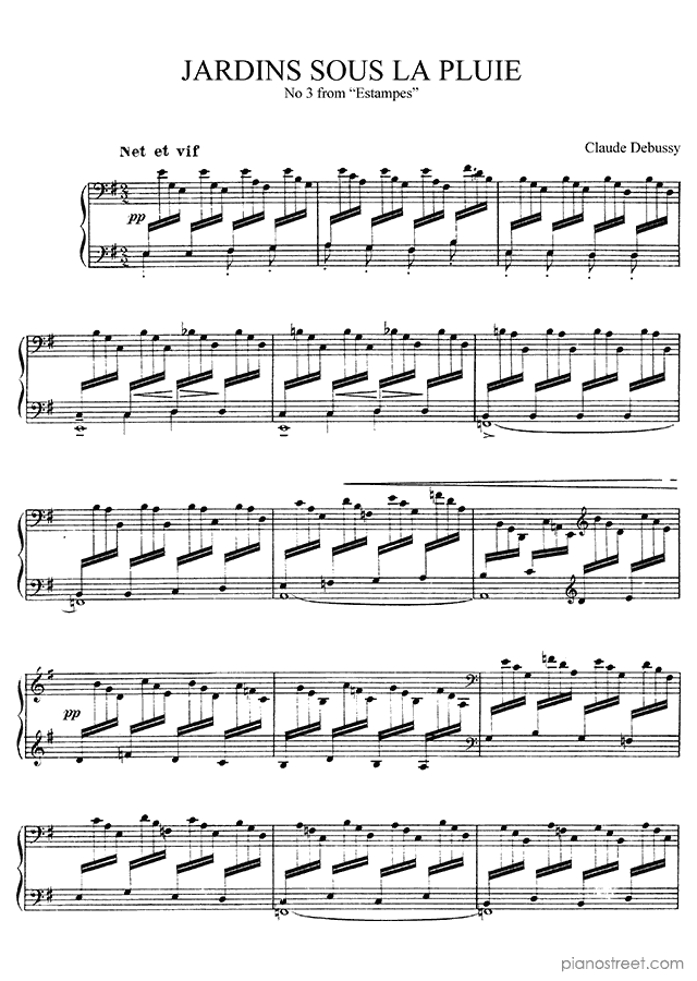Jardins sous la pluie No. 3 in E Minor, by the impressionism composer Claude Debussy. This piano piece was initially published in the year 1903 and is included in Estampes by Debussy.