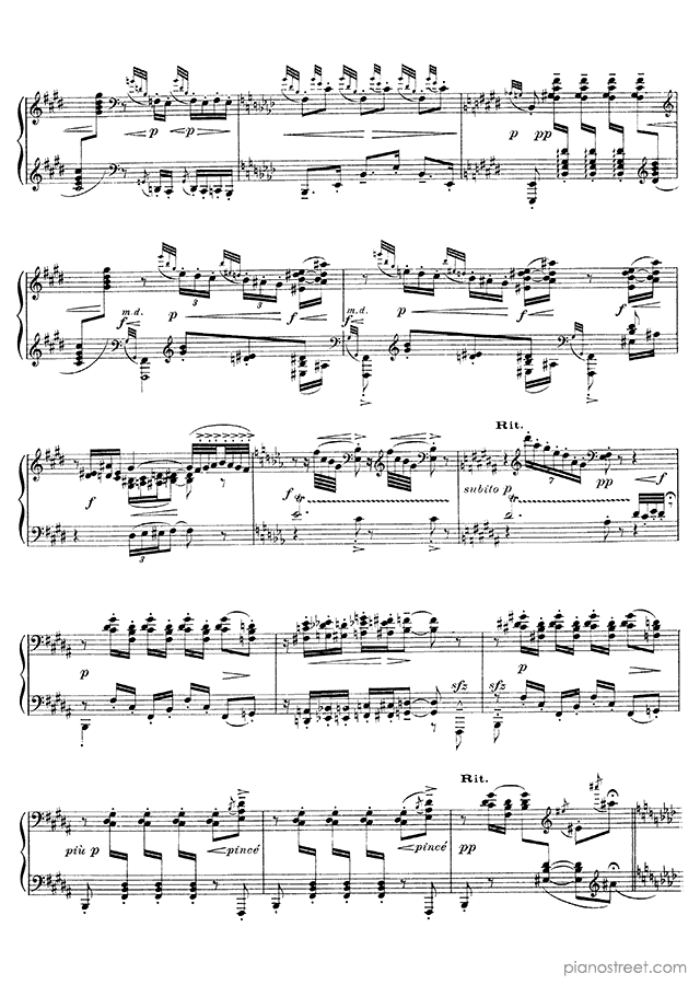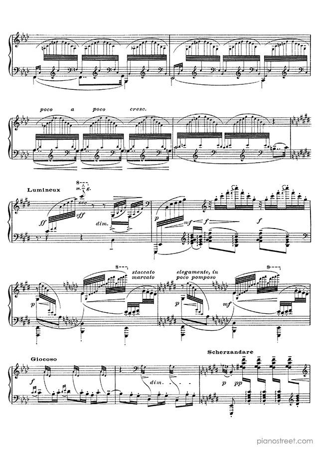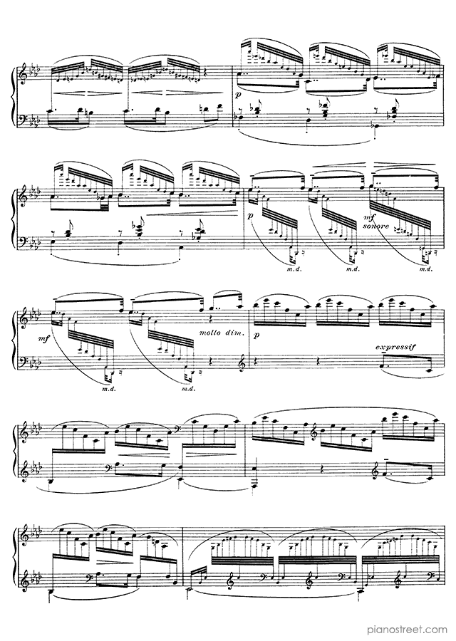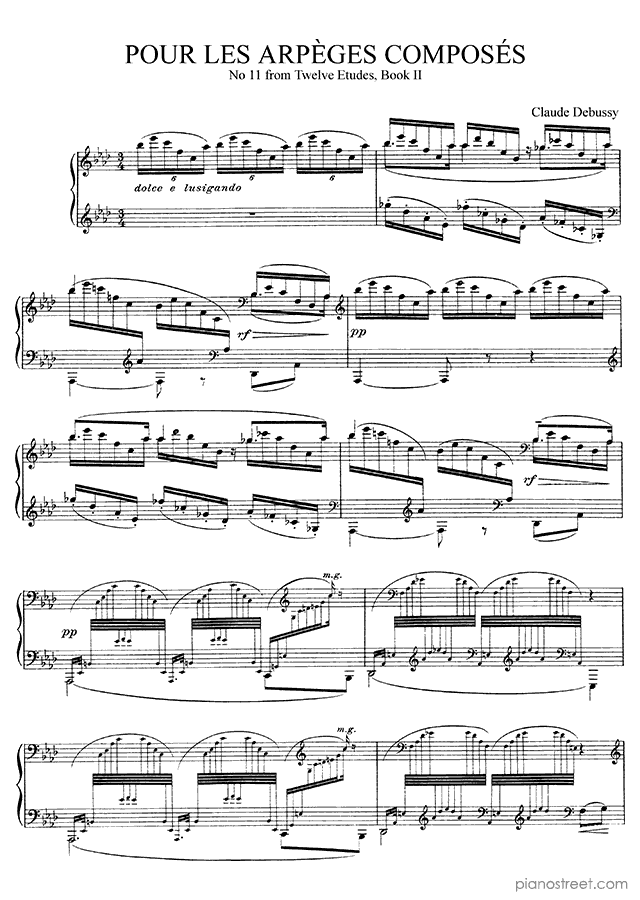 Impressionism piano sheet music by Claude Debussy to download and print instantly: Pour les arpèges composés No. 11 in the key of . Level 8+, compositional type: Study (published in 1915)