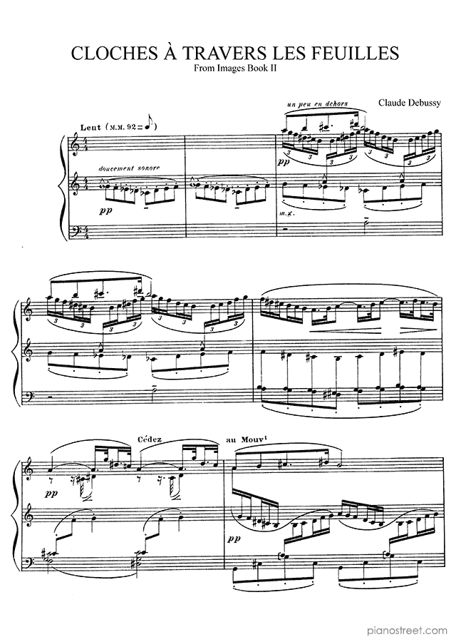 Cloches à travers les feuilles No. 1, a composition by the impressionism composer Claude Debussy who was born in 1862 and died in 1918. The piano score of this piece was first published in 1907 and is part of Debussy's Images Book II.
