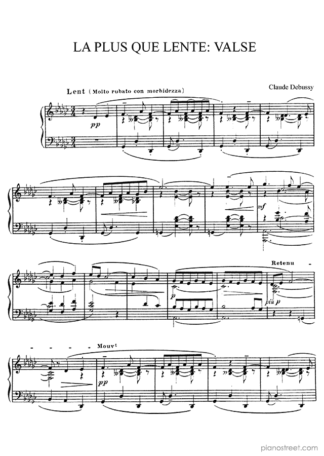 Claude Debussy: La plus que lente in G-flat Major - piano sheet music to print instantly. This piece is level 7 and was composed during the Impressionism period.