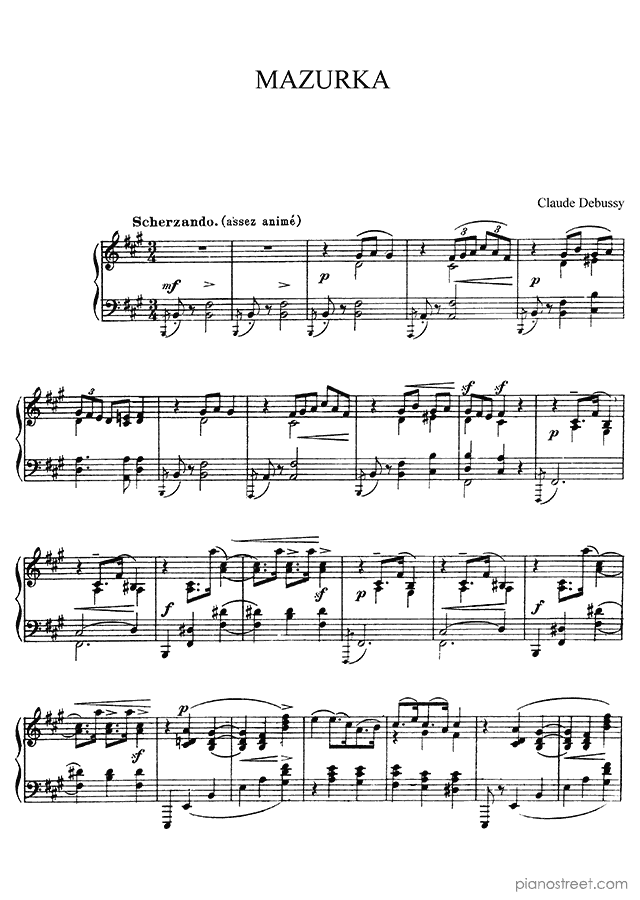 Claude Debussy: Mazurka in F-sharp Minor - piano sheet music to print instantly. This piece is level 8+ and was composed during the Impressionism period.