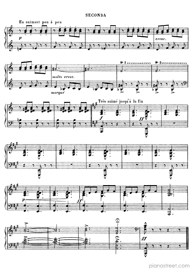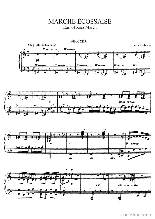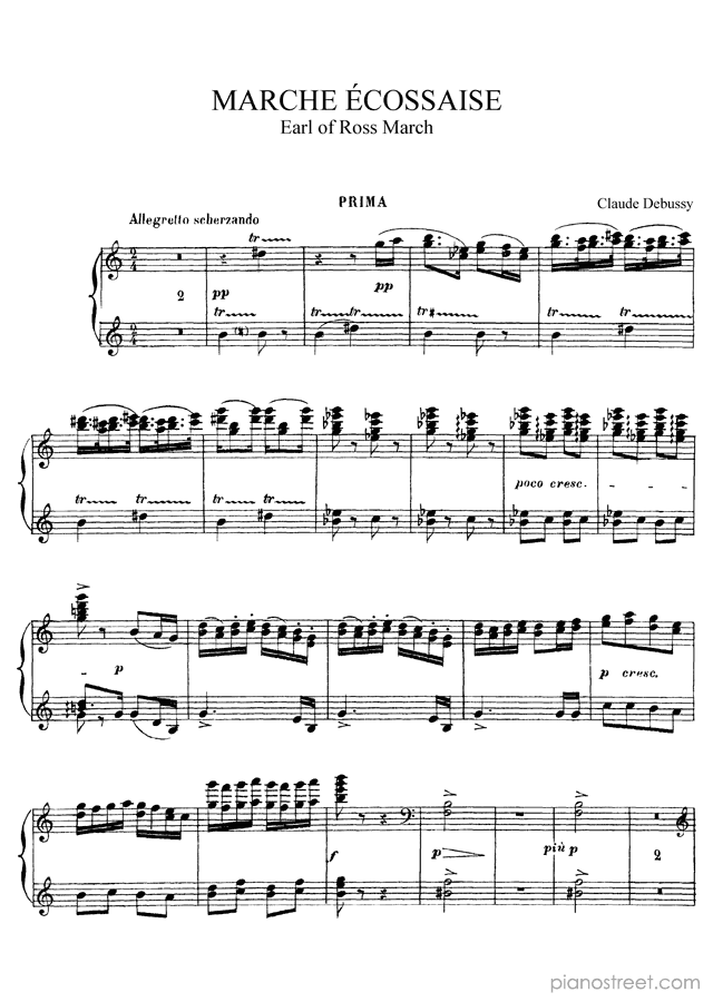 Claude Debussy: Marche écossaise - Earl of Ross March in A Minor - piano sheet music to print instantly. This piece is level 7 and was composed during the Impressionism period.