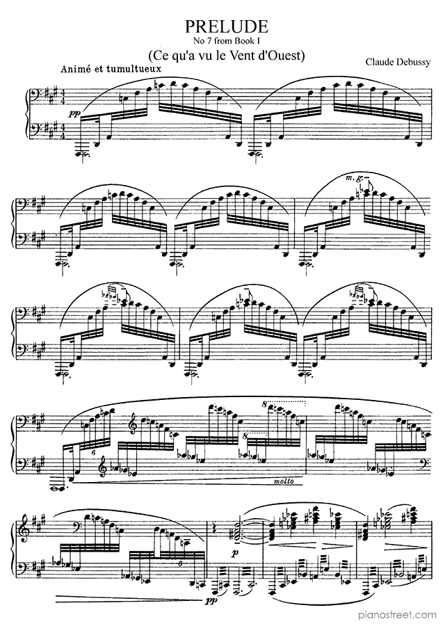 Prelude - Ce qu'a vu le Vent d'Ouest, Book 1 No. 7 by the composer Claude Debussy who lived from 1862 to 1918.