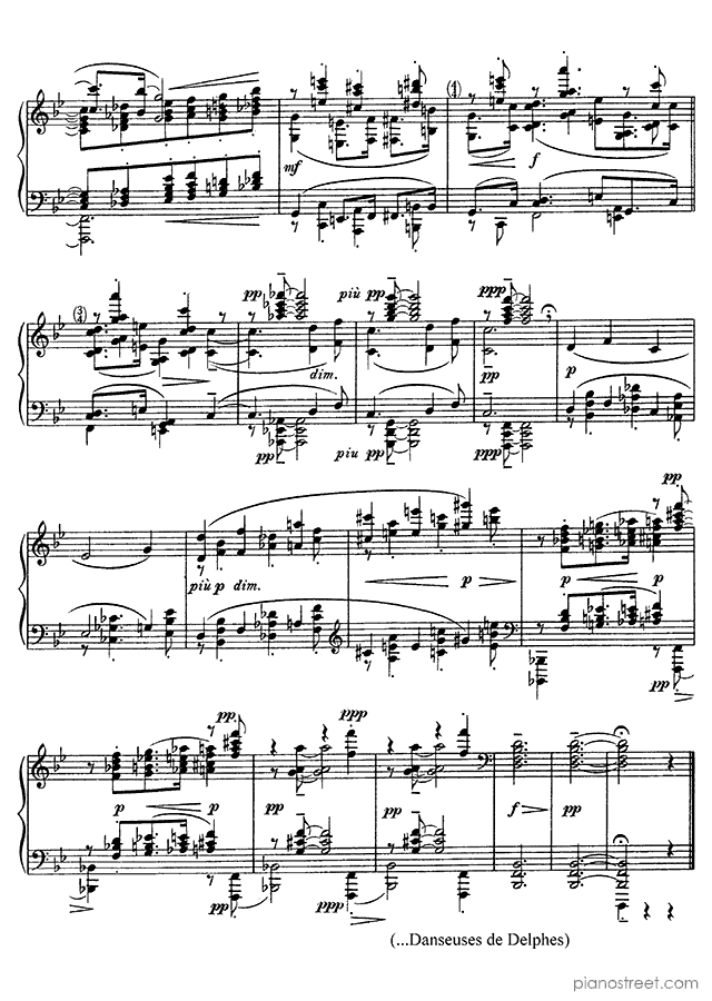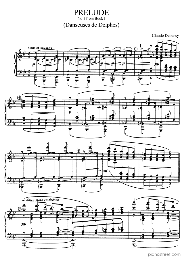 Prelude - Danceuses de Delphes in B-flat Major Book 1 No. 1 by Claude Debussy. Sheet music and recordings of thousands of piano pieces by Claude Debussy and many other famous composers to view in your digital device, print out or listen to.