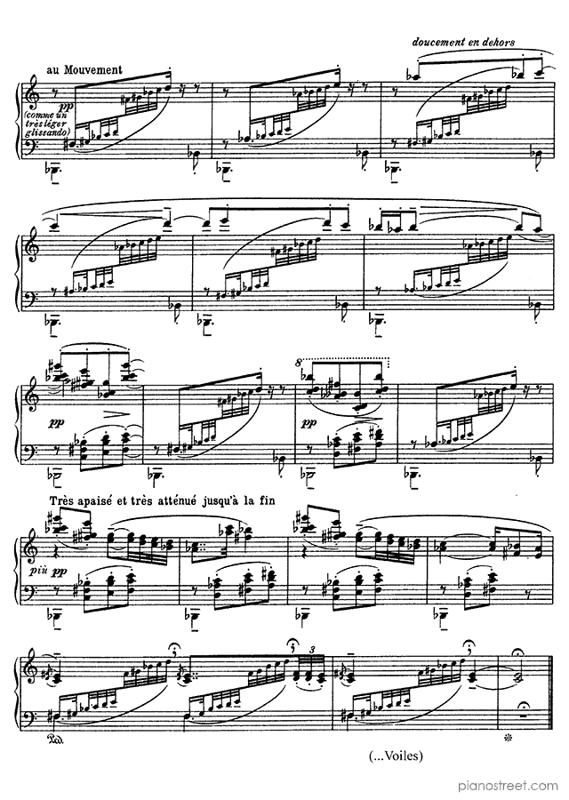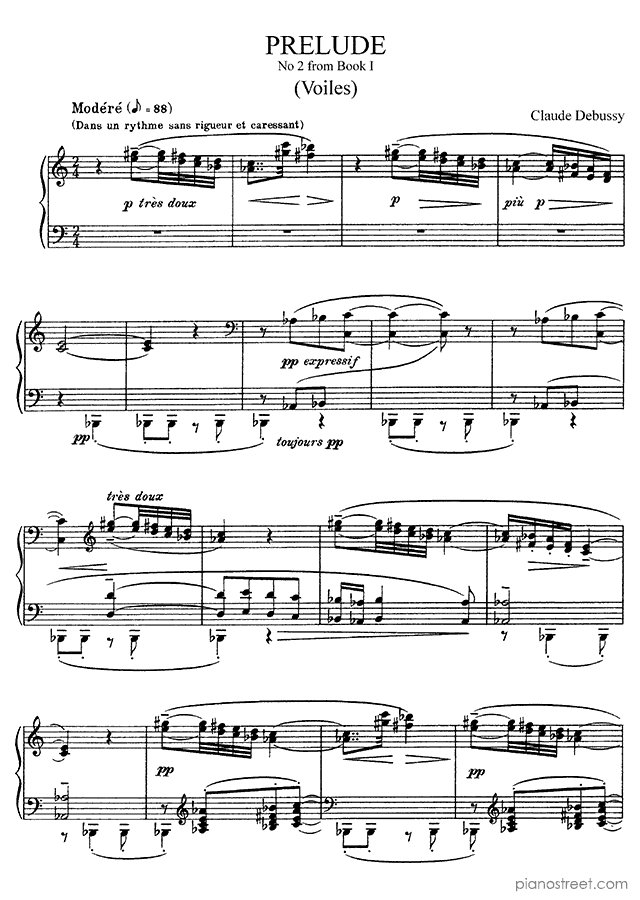 Prelude - Voiles - Book 1 No. 2 is a piano piece by the impressionism composer Claude Debussy who lived between the years 1862 and 1918.