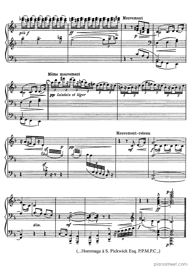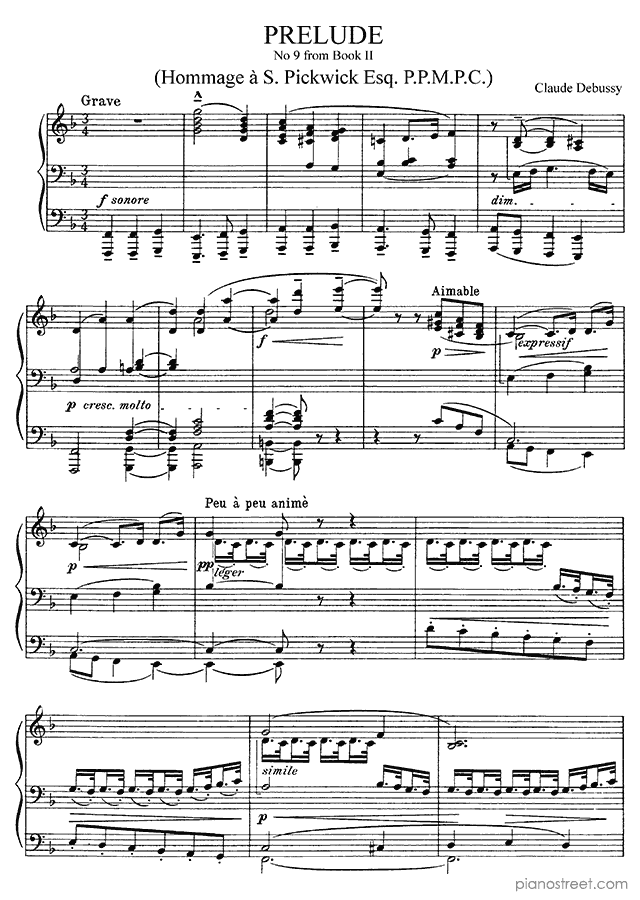 Prelude - Hommage à S. Pickwick Esq. P.P.M.P.C. Book 2 No. 9 by Claude Debussy. Sheet music and recordings of thousands of piano pieces by Claude Debussy and many other famous composers to view in your digital device, print out or listen to.