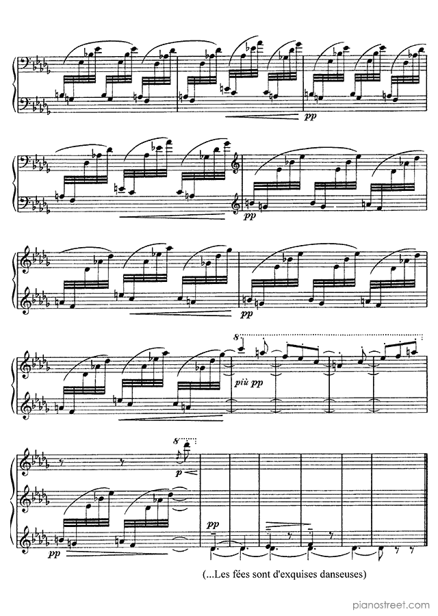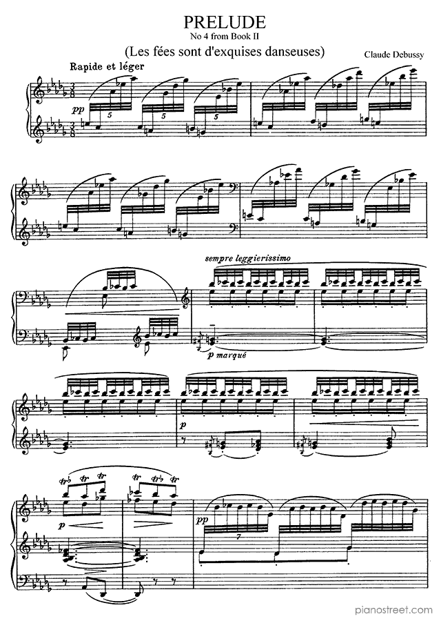 Prelude - Les fées sont d'exquises danseuses Book 2 No. 4, a composition by the impressionism composer Claude Debussy who was born in 1862 and died in 1918. The piano score of this piece was first published in 1913 and is part of Debussy's Preludes.