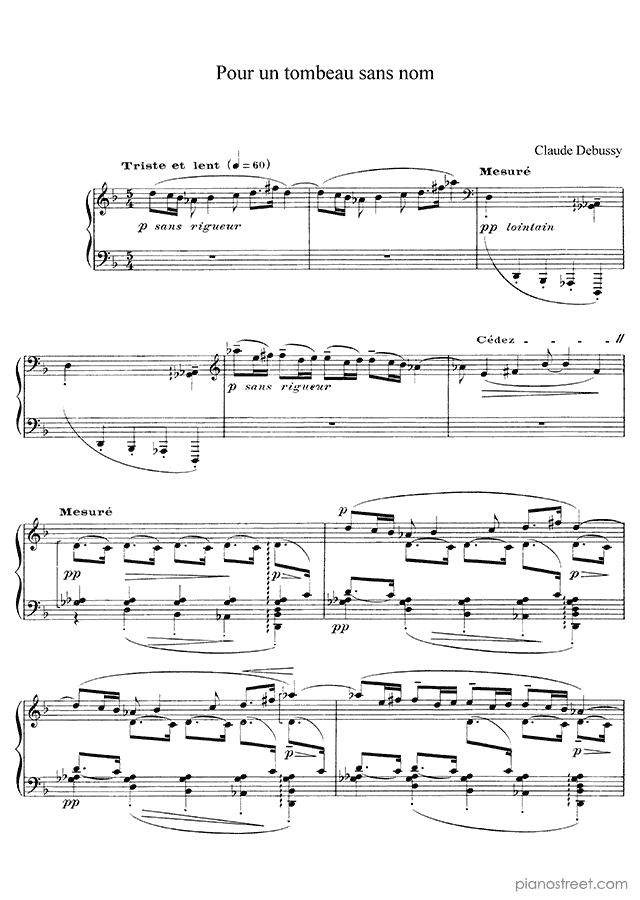 Pour un tombeau sans nom - No. 2 is a piano piece by the impressionism composer Claude Debussy who lived between the years 1862 and 1918.