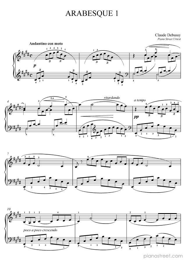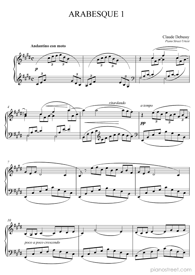 Claude Debussy, who was one of the prominent composers active in the Impressionism era, wrote this piece titled "Arabesque" No. 1 in E Major from Two Arabesques. The composition is categorized as "Piece" in the sheet music library and the level of difficulty in the piano music database is 7.