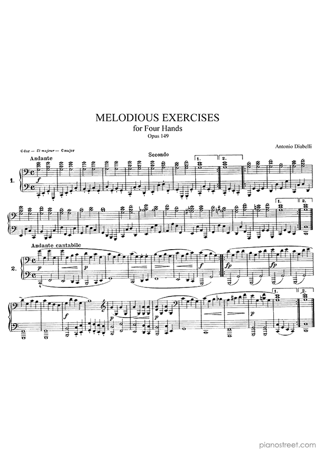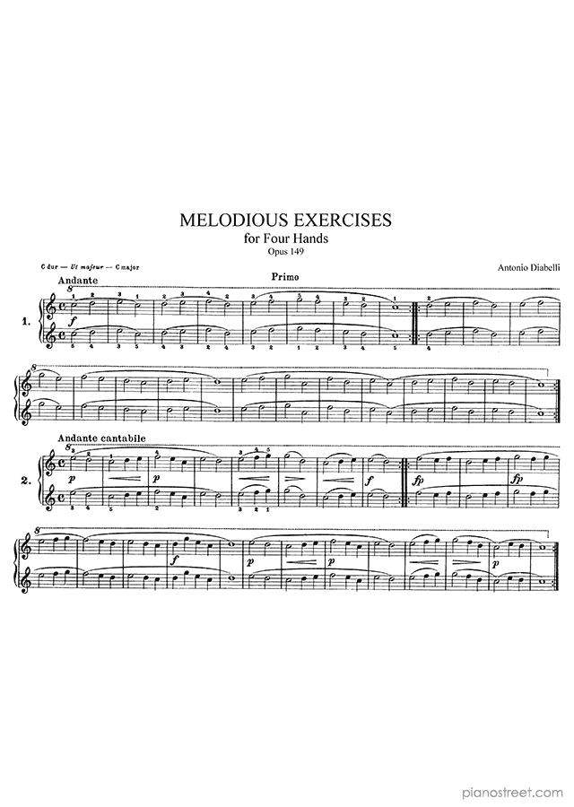 Antonio Diabelli, one of the composers active in the Classical era, wrote this piece titled Melodious Exercise Op. 149 No. 5 in C Major from Melodious Exercices (four hands). The composition is categorized as "Four hands" in Piano Street's sheet music library and the level of difficulty is 1.