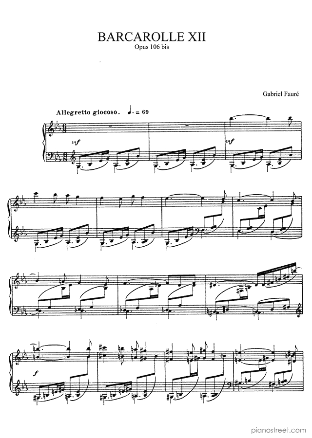 Downloadable piano sheet music from Barcarolles by Gabriel Fauré to print: Barcarolle 12 Op. 106 in E-flat Major