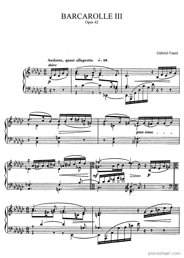 Classical piano sheet music by Fauré to download: Barcarolle 3 Op. 42 in the key of This piece has difficulty level 8+ in the category Piece