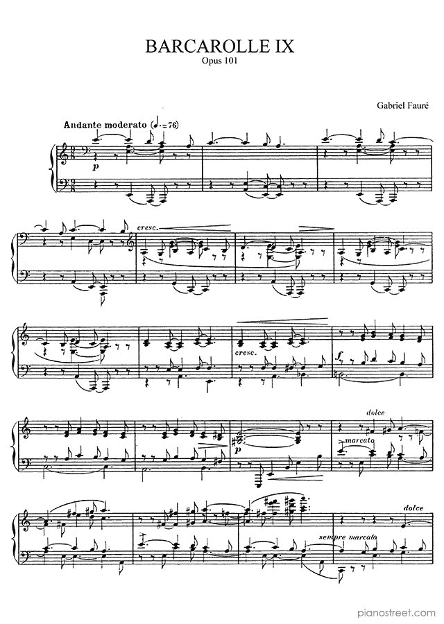 Barcarolle 9 in A Minor - Op. 101 is a piano piece by the late romantic composer Gabriel Fauré who lived between the years 1845 and 1924.