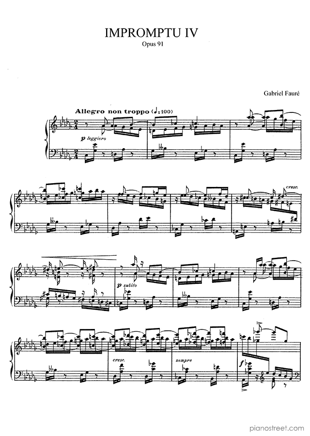 Piano sheet music downloads and recordings. This piece is from Impromptus by Gabriel Fauré: Impromptu 4 Op. 91 in D-flat Major (published in 1906) . Level 8+, Period: Late Romantic