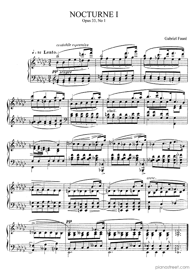 Nocturne 1 in E-flat Minor - Op. 33 No. 1 is a piano piece by the late romantic composer Gabriel Fauré who lived between the years 1845 and 1924.