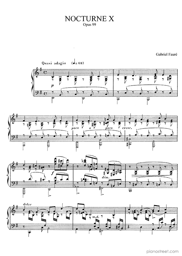Nocturne 10 in E Minor Op. 99 by Gabriel Fauré. Sheet music and recordings of thousands of piano pieces by Gabriel Fauré and many other composers to view in digital devices, print or listen to.