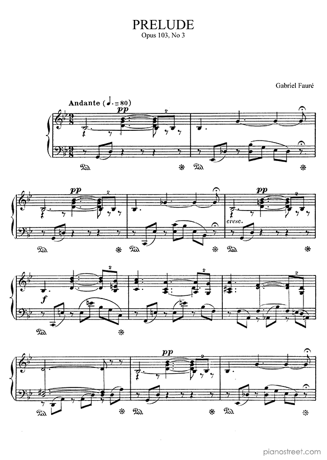 Piano sheet music downloads and recordings. This piece is from Preludes by Gabriel Fauré: Prelude Op. 103 No. 3 in G Minor (published in 1911) . Level 6, Period: Late Romantic