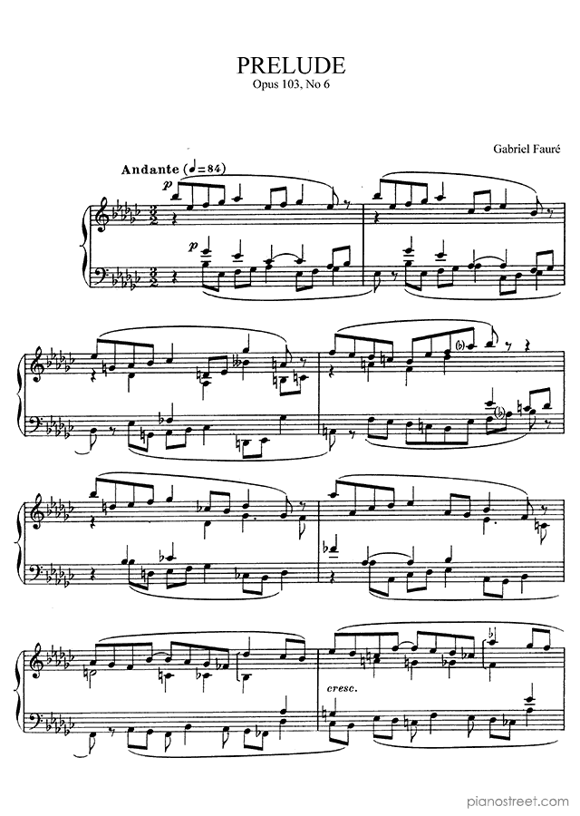Prelude in E-flat Minor Op. 103 No. 6 by Gabriel Fauré. Sheet music and recordings of thousands of piano pieces by Gabriel Fauré and many other composers to view in digital devices, print or listen to.