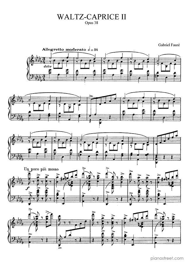 Waltz-Caprice 2 in D-flat Major Op. 38 by Gabriel Fauré. Sheet music and recordings of thousands of piano pieces by Gabriel Fauré and many other composers to view in digital devices, print or listen to.