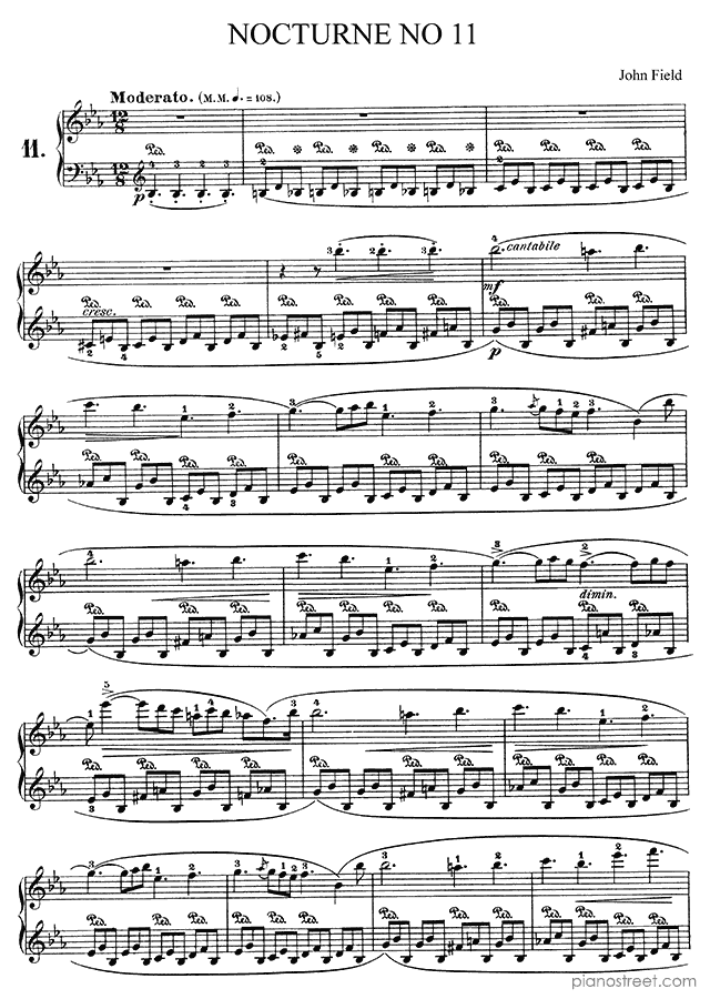 John Field: Nocturne No. 11 in E-flat Major from 18 Nocturnes - piano sheet music to print instantly. This piece is level 7 and was composed during the Early Romantic period.
