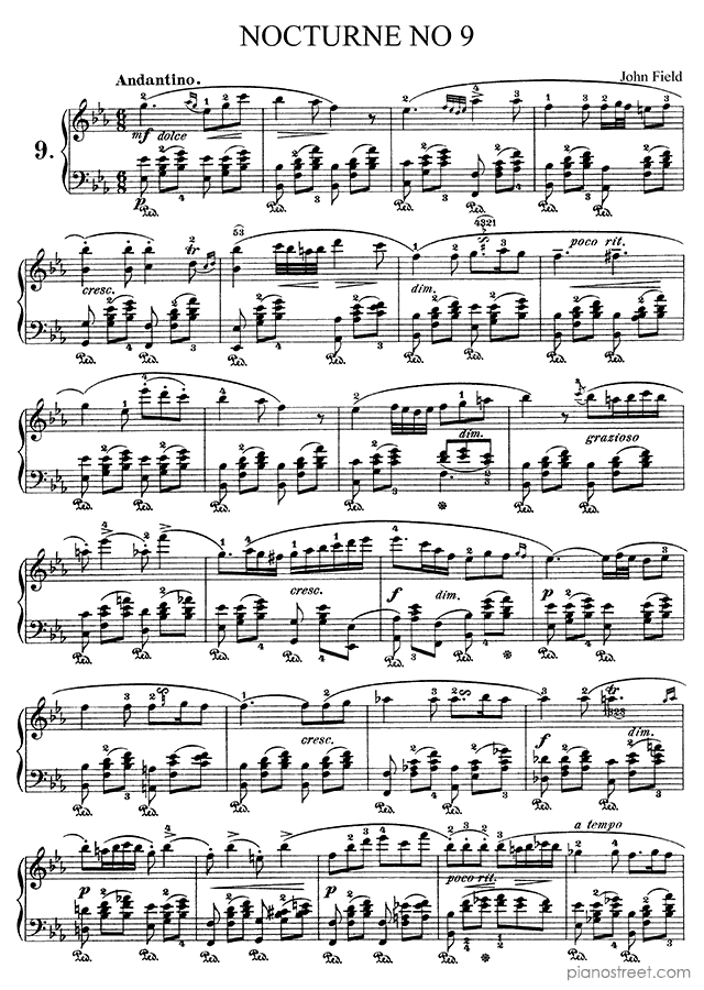 Early Romantic piano sheet music by John Field to download and print instantly: Nocturne No. 9 in the key of . Level 7, compositional type: Piece