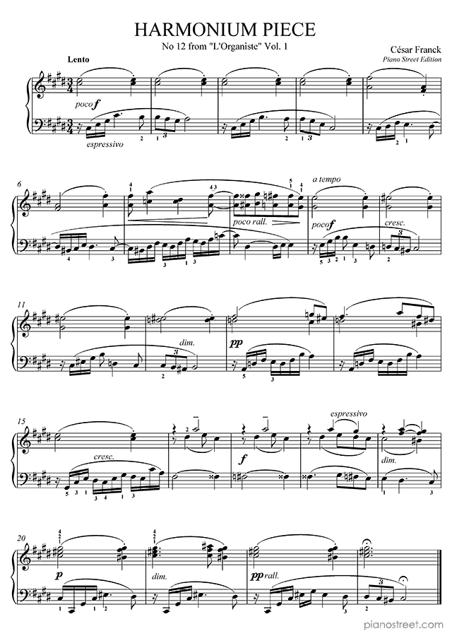 Lento in C-sharp Minor No. 12 by César Franck. Sheet music and recordings of thousands of piano pieces by César Franck and many other composers to view in digital devices, print or listen to.