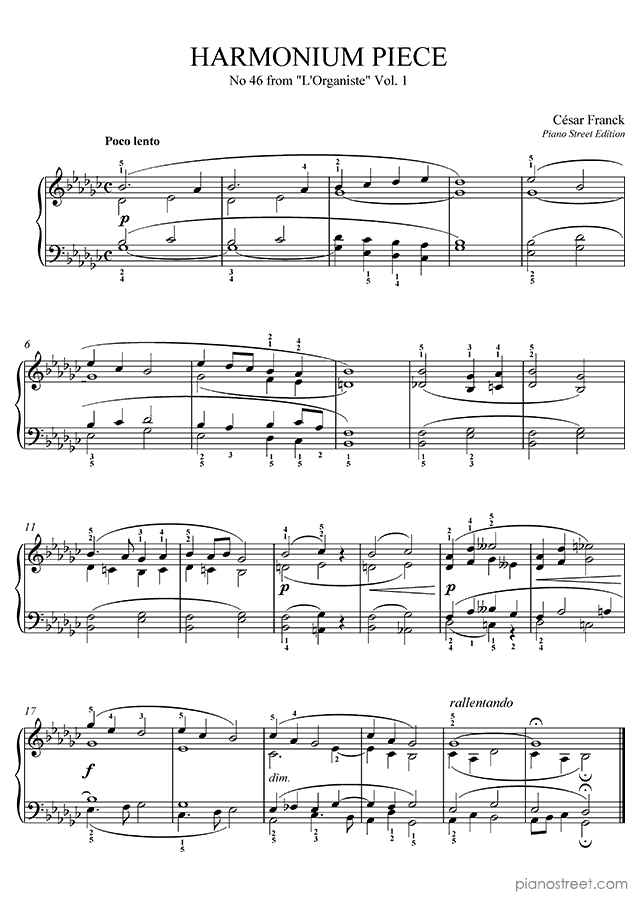 Poco lento in G-flat Major No. 46 by César Franck. Sheet music and recordings of thousands of piano pieces by César Franck and many other composers to view in digital devices, print or listen to.