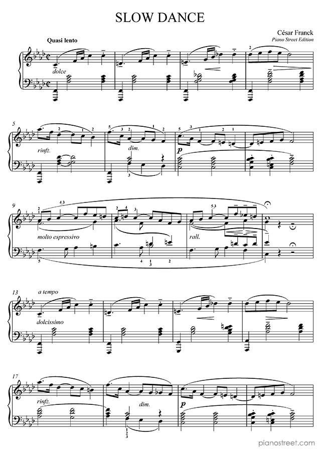 Piano sheet music downloads and recordings. This piece is by César Franck: Slow Dance in F Minor (published in 1885) . Level 4, Period: Early Romantic