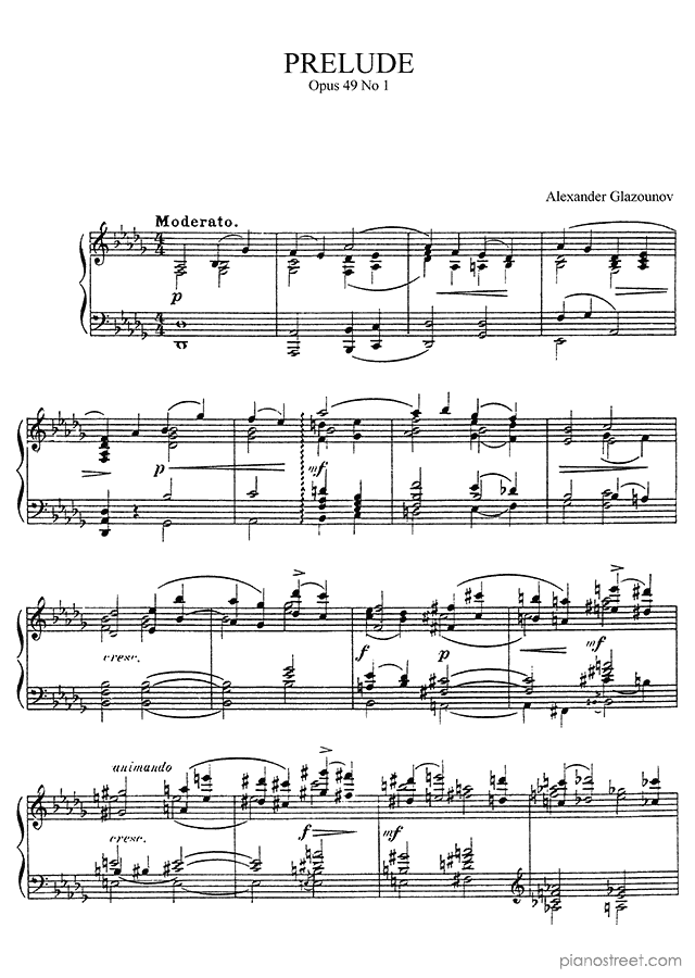 Prelude in D-flat Major Op. 49 No. 1 by Alexander Glazounov. Sheet music and recordings of thousands of piano pieces by Alexander Glazounov and many other famous composers to view in your digital device, print out or listen to.