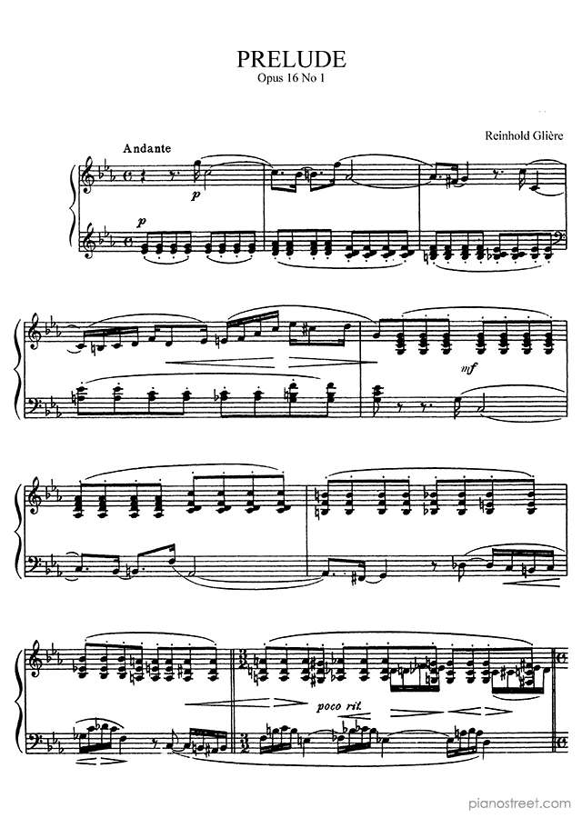 Prelude Op. 16 No. 1 in C Minor, a composition by the late romantic composer Reinhold Glière who was born in 1875 and died in 1956. The piano score of this piece was first published in 1904 and is part of Glière's Miscellaneous pieces.