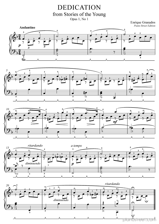 Dedication in F Major Op. 1 No. 1 by Enrique Granados. Sheet music and recordings of thousands of piano pieces by Enrique Granados and many other composers to view in digital devices, print or listen to.