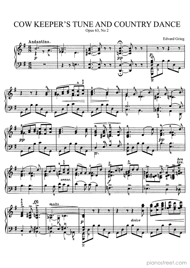 Cow Keeper's Tune and Country Dance in G Major - Op. 63 No. 2 is a piano piece by the early romantic composer Edvard Grieg who lived between the years 1843 and 1907.