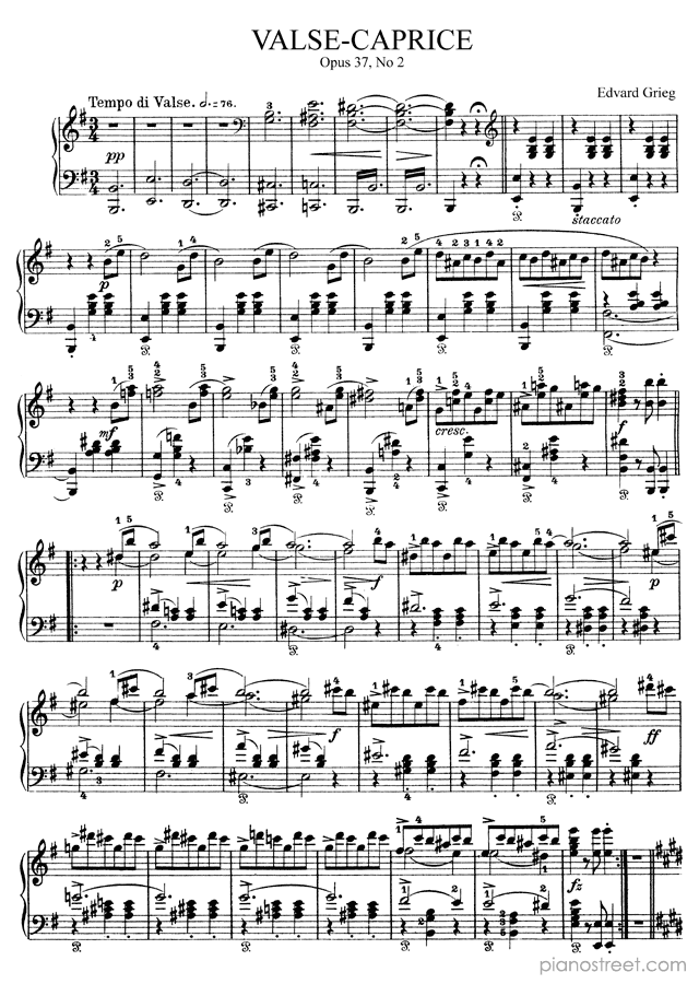 Edvard Grieg: Valse-Caprice Op. 37 No. 2 in E Minor from 2 Valse-Caprices - piano sheet music to print instantly. This piece is level 7 and was composed during the Early Romantic period.