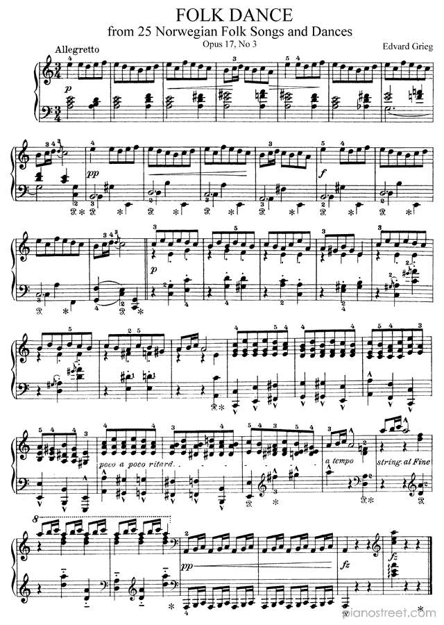 Folk Dance in A Minor - Op. 17 No. 3 is a piano piece by the early romantic composer Edvard Grieg who lived between the years 1843 and 1907.