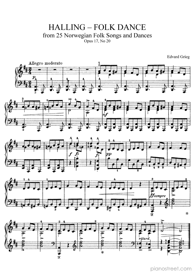 Edvard Grieg: Halling - Folk Dance Op. 17 No. 20 in D Major from 25 Norwegian Folk Songs and Dances - piano sheet music to print instantly. This piece is level 4 and was composed during the Early Romantic period.