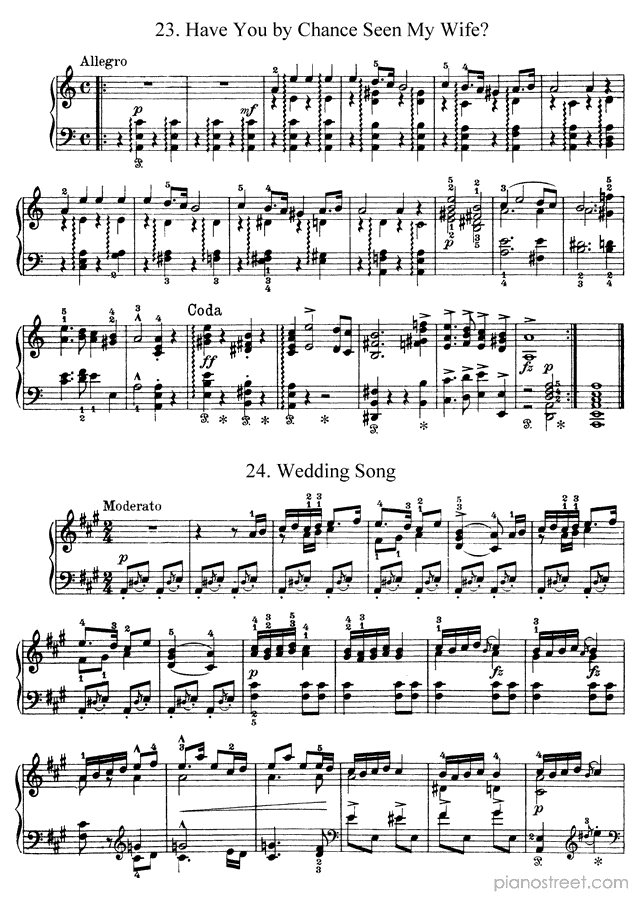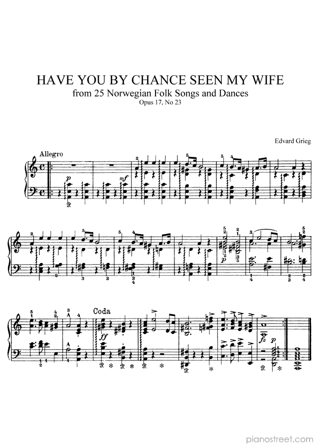 Have You by Chance Seen My Wife? in A Minor - Op. 17 No. 23 is a piano piece by the early romantic composer Edvard Grieg who lived between the years 1843 and 1907.