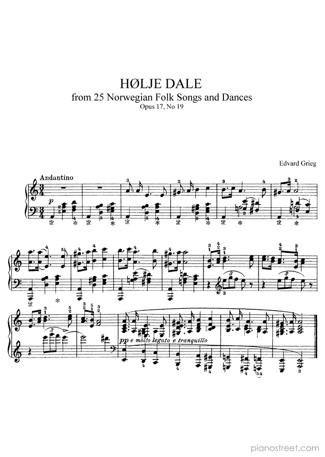 Piano sheet music downloads and recordings. This piece is from 25 Norwegian Folk Songs and Dances by Edvard Grieg: Holje Dale Op. 17 No. 19 in A Minor (published in 1869) . Level 4, Period: Early Romantic