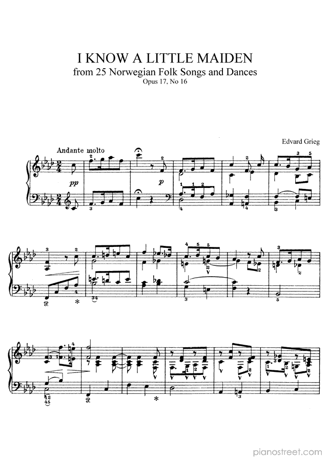 I Know a Little Maiden Op. 17 No. 16 in F Minor, a composition by the early romantic composer Edvard Grieg. The piano score of this piece was first published in 1869 and is part of 25 Norwegian Folk Songs and Dances by Grieg.