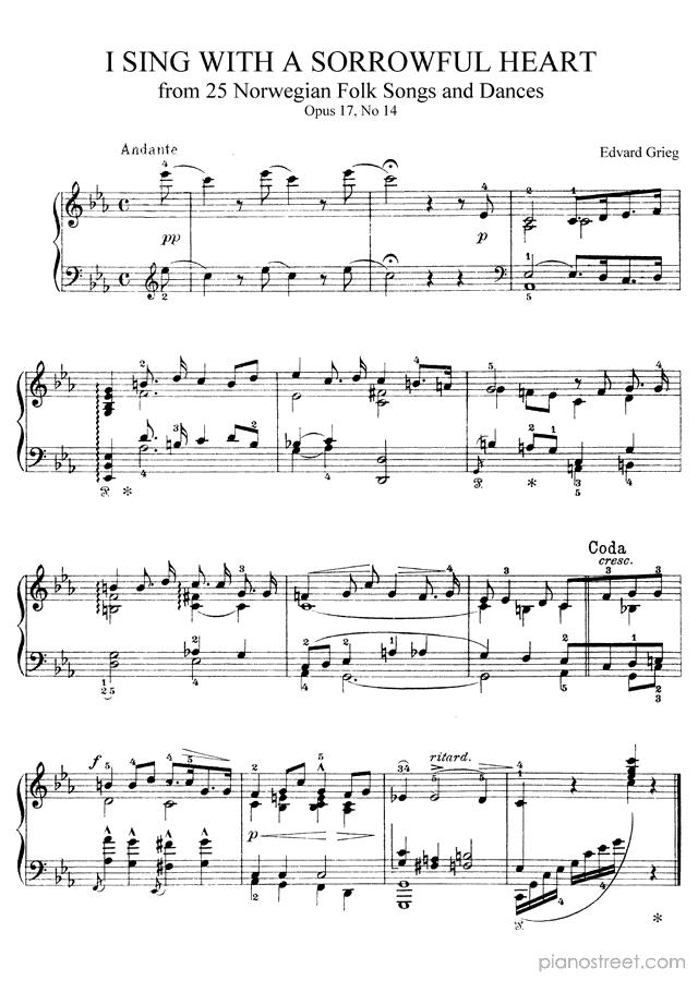 DOWNLOAD: Edvard Grieg - I Sing with a Sorrowful Heart Op. 17 No. 14 in C Minor ( from 25 Norwegian Folk Songs and Dances by Grieg). Piano sheet music to print immediately or to view in mobile devices.