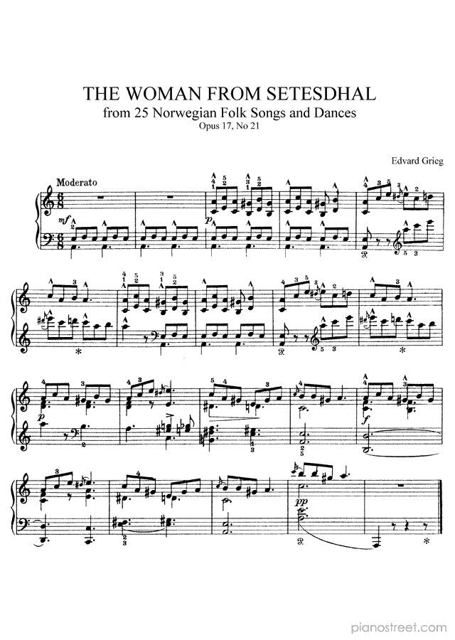 Grieg: The Woman from Setesdhal Op. 17 No. 21 in A Minor (published in 1869) . DOWNLOAD piano sheet music from Piano Street digital sheet music library.